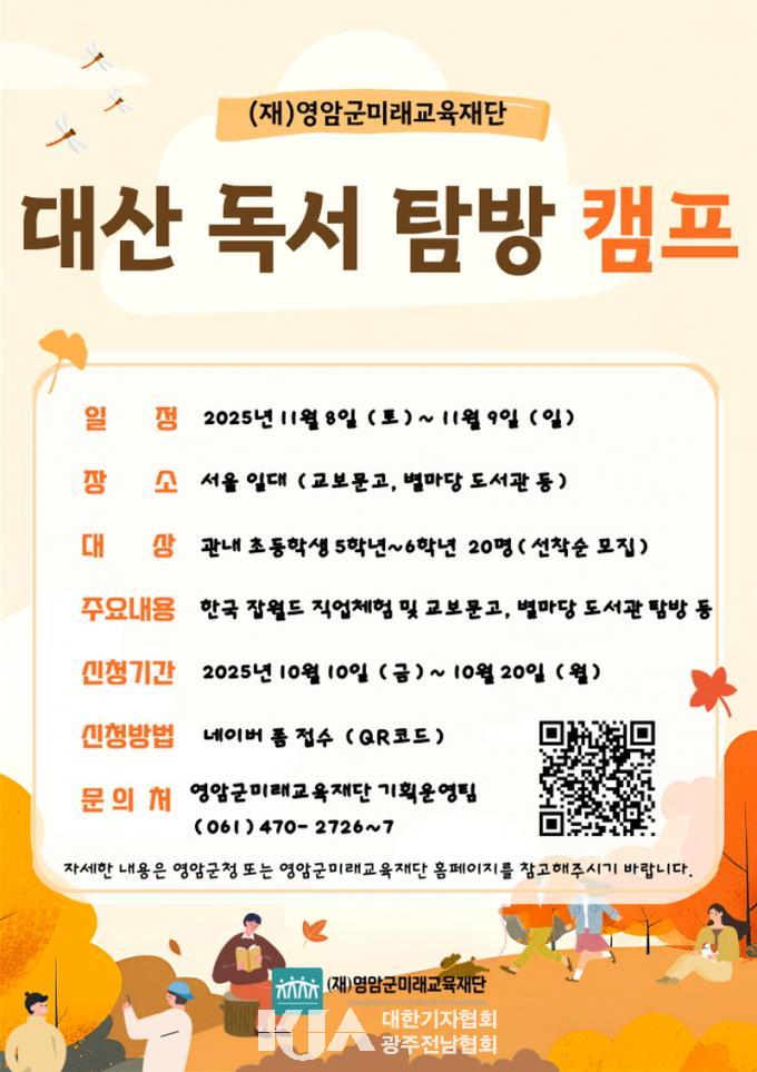 [´ëÇѱâÀÚÇùȸ ¿µ¾Ï±ºÁöȸ] (Àç)¿µ¾Ï±º¹Ì·¡±³À°Àç´ÜÀÌ Áö¿ª µ¶¼­ ¹®È­ ÁõÁø°ú ¾Æµ¿ Áø·Î Ž»ö ±âȸ Á¦°øÀ» ÃëÁö·Î ÇÑ ¡®2025³â ´ë»ê µ¶¼­ ޹æ Ä·ÇÁ¡¯ Âü°¡ÀÚ¸¦ 10~20ÀÏ ¸ðÁýÇÑ´Ù.