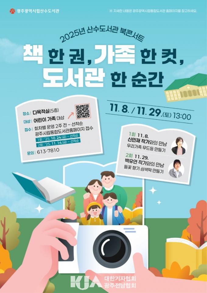 »ê¼öµµ¼°üÀ» ÀÌ¿ëÇÏ´Â ¾î¸°ÀÌ °¡Á·Àº ´©±¸³ª Âü¿©ÇÒ ¼ö ÀÖÀ¸¸ç, Âü°¡ ½ÅûÀº 10¿ù 24ÀϺÎÅÍ ±¤Áֽø³µµ¼°ü ´©¸®Áý(citylib.gwangju.go.kr)À» ÅëÇØ ¼±Âø¼ø(1ȸÂ÷-8ÀÏ 15°¡Á·, 2ȸÂ÷-29ÀÏ 12°¡Á·) Á¢¼öÇÑ´Ù. ÀÚ¼¼ÇÑ »çÇ×Àº ´©¸®ÁýÀ» Âü°íÇϰųª »ê¼öµµ¼°ü(613-7810)À¸·Î ¹®ÀÇÇÏ¸é µÈ´Ù.