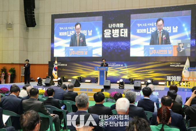 À±º´Å ³ªÁÖ½ÃÀåÀº ¡°½Ã¹ÎÀÇ ³¯Àº ¿ì¸® ¸ðµÎ°¡ ³ªÁÖÀÇ ÁÖÀÎÀÓÀ» È®ÀÎÇÏ´Â ¼ÒÁßÇÑ ³¯¡±À̶ó¸ç ¡°¿À´ÃÀÇ ¼º°ú¿¡ ¸Ó¹°Áö ¾Ê°í ½Ã¹Î°ú ÇÔ²² ´õ Å« ³ªÁÖ, ¿µ»ê° ¸£³×»ó½º¸¦ ÇâÇØ ³ª¾Æ°¡°Ú´Ù¡±°í ¸»Çß´Ù.