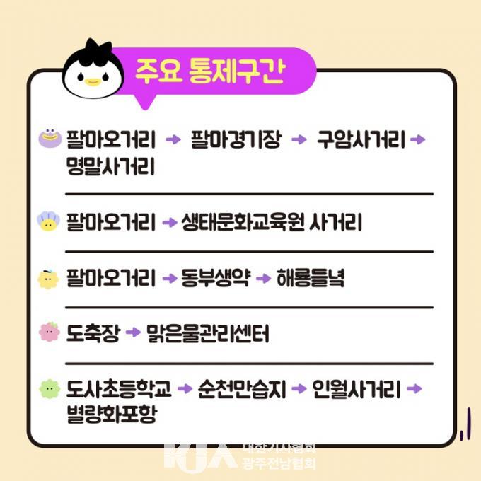 ´ëȸ ´çÀÏÀÎ ¿ÀÀü 8½ÃºÎÅÍ ¿ÀÈÄ 1½Ã 30ºÐ±îÁö ¸¶¶óÅæ ÄÚ½º ÁÖ¿ä µµ·Î¿¡¼ ±³ÅëÀÌ ÅëÁ¦µÈ´Ù. ÆÈ¸¶¿À°Å¸®¿¡¼ ÆÈ¸¶Á¾ÇտÀå°ú ¼øÃµ¸¸±¹°¡Á¤¿ø ¹æÇâ ÁøÀÔÀÌ ±ÝÁöµÇ¸ç, »ýŹ®È±³À°¿ø¿¡¼ ¸¼Àº¹°°ü¸®¼¾ÅÍ ±¸°£Àº Àü¸é ÅëÁ¦, µµ»çÃʵîÇб³¿¡¼ Àοù»ç°Å¸® ¹æÇâÀº ÀϹæÅëÇàÀ¸·Î ¿î¿µµÈ´Ù.
