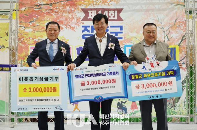 Áö³ 11¿ù 4ÀÏ, ÀåÈï½Ç³»Ã¼À°°ü¿¡¼ ¿¸° ¡®Á¦14ȸ ÀåÈﱺ Àå¾ÖÀÎ ÇѸ¶À½ ´ëÃàÁ¦¡¯ÇöÀå¿¡¼ Àü¶ó³²µµÁöüÀå¾ÖÀÎÇùȸ ÀåÈﱺÁöȸ°¡ ÀÎÀçÀ°¼ºÀåÇÐ±Ý 300¸¸ ¿øÀ» ±âºÎÇß´Ù.
