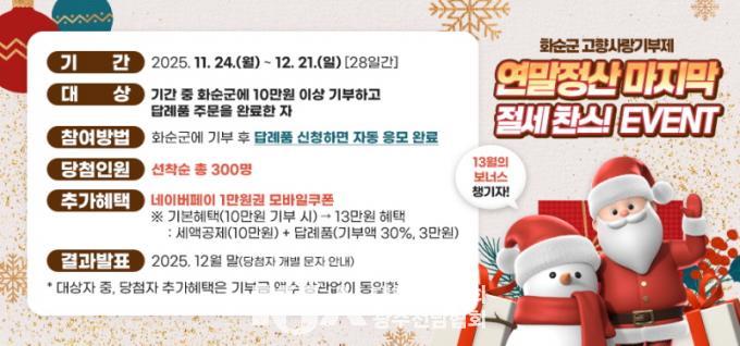| ȼø±º, °íÇâ»ç¶û±âºÎÁ¦ ¡®¿¬¸»Á¤»ê Àý¼¼ Âù½º¡¯ ´ë±Ô¸ð À̺¥Æ® ÃßÁø ¡®10¸¸ ¿ø ÀÌ»ó ±âºÎ ½Ã, ³×À̹öÆäÀÌ 1¸¸ ¿ø ¸ð¹ÙÀÏ ÄíÆù(300¸í) Ãß°¡ ÁõÁ¤¡¯ |