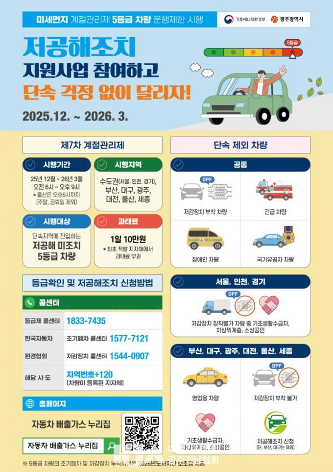 | ±¤ÁÖ±¤¿ª½Ã, 12¿ùºÎÅÍ ¹èÃâ°¡½º 5µî±Þ Â÷·® ¿îÇàÁ¦ÇÑ ¹Ì¼¼¸ÕÁö ±Ø½ÉÇÑ °Ü¿ïö 4°³¿ù°£ ÆòÀÏ ¿ÀÀü 6½Ã¡¹ã 9½Ã Á¦ÇÑ |