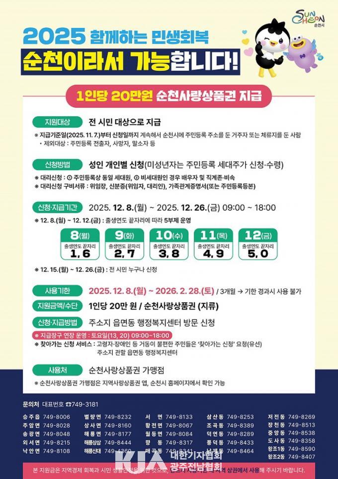 Áö¿ø±ÝÀº Áö±Þ±âÁØÀÏÀÎ 2025³â 11¿ù 7ÀϺÎÅÍ ½ÅûÀϱîÁö °è¼ÓÇØ ¼øÃµ½Ã¿¡ Áֹεî·Ï ÁÖ¼Ò¸¦ µÐ ½Ã¹Î¿¡°Ô 1Àδç 20¸¸ ¿øÀÌ Áö±ÞµÈ´Ù. ¼øÃµ»ç¶û»óǰ±Ç(Áö·ù, 1¸¸ ¿ø±Ç)À¸·Î Áö±ÞµÇ¸ç, »óǰ±ÇÀº 2025³â 12¿ù 8ÀϺÎÅÍ 2026³â 2¿ù 28ÀϱîÁö 3°³¿ù°£ »ç¿ë °¡´ÉÇÏ´Ù.