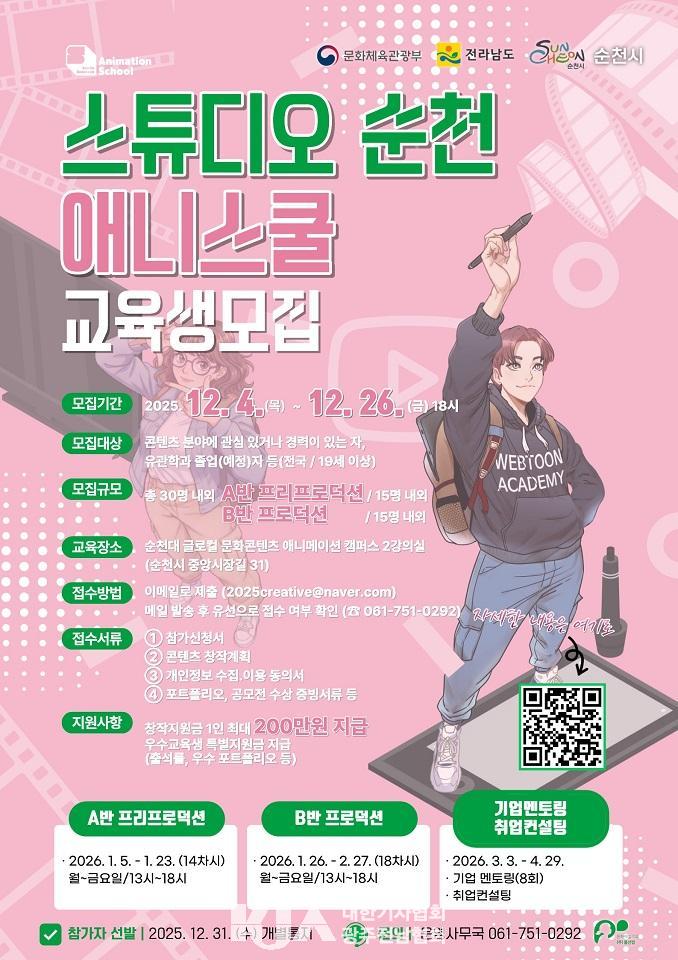 ¡®½ºÆ©µð¿À ¼øÃµ(Studio Suncheon)¡¯Àº ´ëÇѹα¹ ¹®Èµµ½Ã »ç¾÷À¸·Î ÃßÁøÇÏ´Â ÄÜÅÙÃ÷ Àü¹® ¾ÆÄ«µ¥¹Ì·Î, Áö¿ª¿¡ Á¤ÂøÇÑ ÄÜÅÙÃ÷ ±â¾÷°ú Çù·ÂÇØ ¼øÃµ »ê¾÷ÇöÀå¿¡ Æ¯ÈµÈ ½Ç¹« Á᫐ ±³À°°úÁ¤À» Á¦°øÇÑ´Ù. ±³À°Àº À¥Å÷, ¾Ö´Ï¸ÞÀÌ¼Ç 2°¡Áö ºÐ¾ß·Î ±¸¼ºµÇ¸ç, À¥Å÷Àº ±Û·Î¹úÀ¥Å÷Çãºê¼¾ÅÍ¿¡¼, ¾Ö´Ï¸ÞÀ̼ÇÀº ±Û·ÎÄà ¾Ö´Ï¸ÞÀ̼Ç‧¹®ÈÄÜÅÙÃ÷ Ä·ÆÛ½º¿¡¼ 2026³â 1¿ùºÎÅÍ 4¿ù±îÁö ¾à 4°³¿ù°£ ÁøÇàµÈ´Ù.