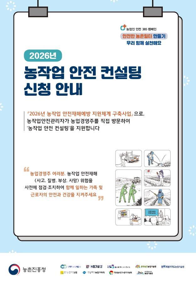 À̹ø »ç¾÷Àº ³ó¾÷ ºÐ¾ß Áß´ëÀçÇØ ¿¹¹æ°ú ¾ÈÀüÇÑ ³óÀÛ¾÷ ȯ°æ Á¶¼ºÀ» À§ÇØ ¸¶·ÃµÆ´Ù. ³óÀÛ¾÷ ¾ÈÀü°ü¸®ÀÚ°¡ ³ó¾÷°æ¿µÁÖ¸¦ Á÷Á¢ ¹æ¹®ÇØ ³óÀÛ¾÷ ÇöÀåÀÇ À§Çè ¿äÀÎÀ» Áø´ÜÇÏ°í ³ó°¡ ¿©°Ç¿¡ ¸Â´Â ¸ÂÃãÇü ¾ÈÀü°ü¸® ÄÁ¼³ÆÃÀ» Á¦°øÇÑ´Ù.