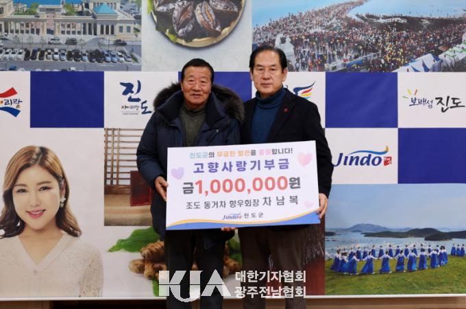 | Áøµµ±º Á¶µµ¸é Â÷³²º¹ µ¿°ÅÂ÷ Çâ¿ìȸÀå, Áøµµ±º¿¡ °íÇâ»ç¶û±âºÎ±Ý Àü´Þ °íÇâ Áøµµ¸¦ ÀÀ¿øÇϱâ À§ÇØ 3³â ¿¬¼ÓÀ¸·Î ¸Å³â 100¸¸ ¿ø¾¿ ±âºÎ |