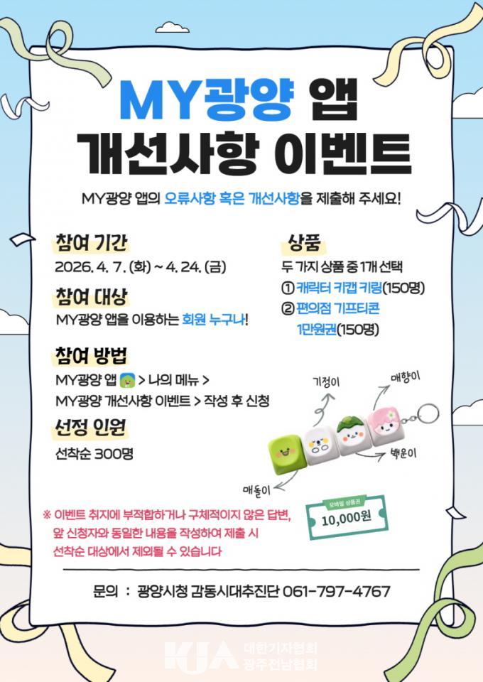 | ±¤¾ç½Ã, ¡®MY±¤¾ç ¾Û °³¼±»çÇ× À̺¥Æ®¡¯ ¿î¿µ ¼±Âø¼ø 300¸í °æÇ° Á¦°ø ¾Û ¿À·ù ½Å°í ¹× ±â´É °³¼± ¾ÆÀ̵ð¾î Á¢¼ö¡¦ÀÌ¿ëÀÚ ÀÇ°ß ¹Ý¿µ |