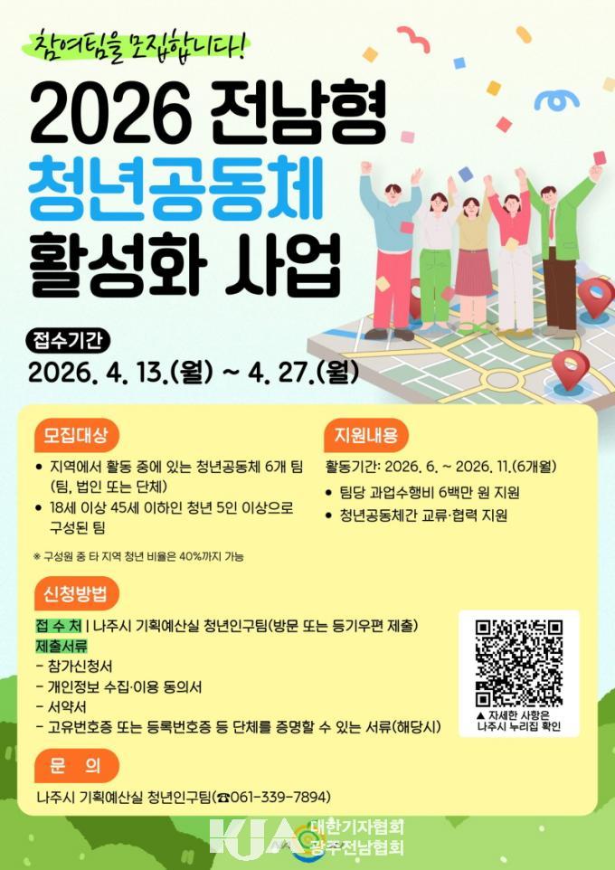 | ³ªÁÖ½Ã, 2026³â ¡®Ã»³â°øµ¿Ã¼ Ȱ¼ºÈ »ç¾÷¡¯ Âü¿©ÆÀ ¸ðÁý 4¿ù 13ÀϺÎÅÍ 27ÀϱîÁö Á¢¼ö¡¦6°³ ÆÀ ¼±¹ß, 600¸¸ ¿ø Áö¿ø |