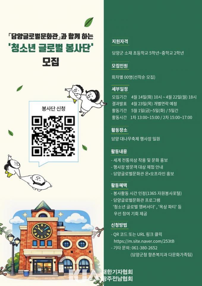 ¸ðÁý ´ë»óÀº ´ã¾ç±º ¼ÒÀç ÃʵîÇб³ 5ÇгâºÎÅÍ ÁßÇб³ 2Çг⿡ ÀçÇÐ ÁßÀΠû¼Ò³âÀ¸·Î, ÃàÁ¦ ±â°£ÀÎ 5¿ù 1ÀϺÎÅÍ 5ÀϱîÁö 5Àϰ£ ¸ÅÀÏ ¿ÀÈÄ 1½ÃºÎÅÍ 5½Ã±îÁö 2½Ã°£¾¿ Á¶¸¦ ³ª´² ¿î¿µÇÒ ¿¹Á¤ÀÌ´Ù.
