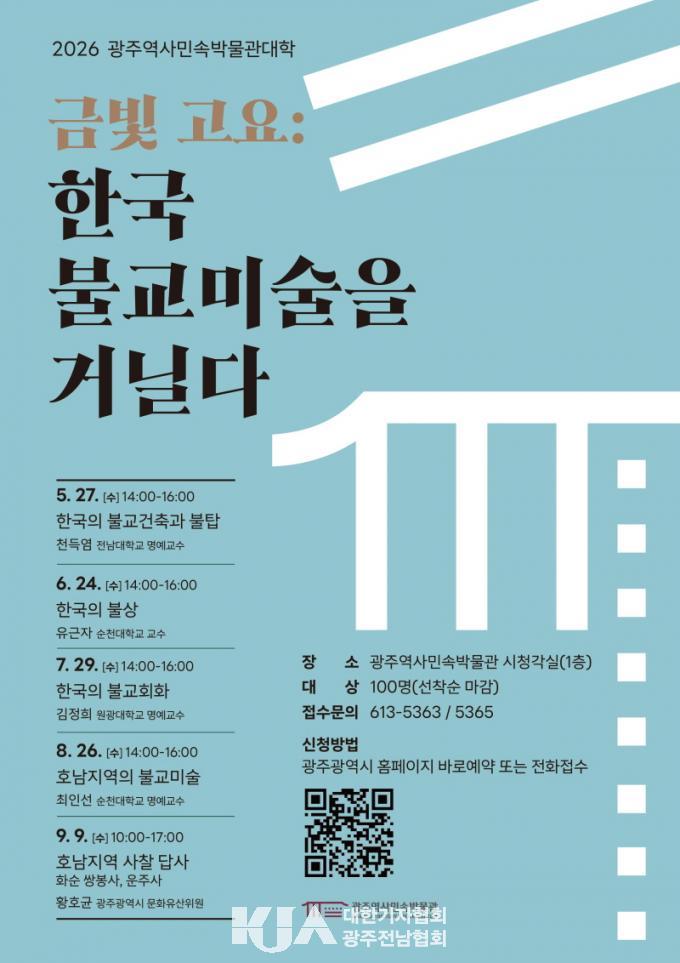 À̹ø °­Á´ Çѱ¹ ºÒ±³¹Ì¼ú¿¡ ´ëÇÑ ÀÌÇØ¸¦ ³ÐÈ÷°í Áö¿ª ¹®È­À¯»êÀÇ °¡Ä¡¸¦ Àç¹ß°ßÇÏ´Â ¶æ±íÀº ±âȸ°¡ µÉ °ÍÀ¸·Î ±â´ëµÈ´Ù. ¼ö°­ ½ÅûÀº ¿À´Â 5¿ù 1ÀϺÎÅÍ 20ÀϱîÁö ±¤Áֽà ´©¸®Áý ¡®¹Ù·Î¿¹¾à¡¯(www.gwangju.go.kr/reserve/)À» ÅëÇØ °¡´ÉÇϸç, ¼±Âø¼ø 100¸íÀ» ¸ðÁýÇÑ´Ù.