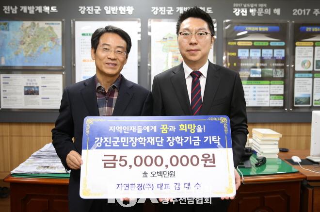 ÀÚ¿¬È¯°æ(ÁÖ) ±è´ë¼ö´ëÇ¥´Â °Ç¼³Æó±â¹° Áß°£Ã³¸®¾÷ü(°Áø±º ¼ºÀü¸é ¼ÒÀç)¸¦ ¿î¿µÇϰí ÀÖ´Ù. ºÎÄ£ °í ±èÇâ¿Á¾¾´Â 2006³âºÎÅÍ 2010±îÁö 5õ3¹é¸¸¿øÀ» ±âŹÇß´Ù. ±è´ë¼ö´ëÇ¥´Â ÈÄÁø¾ç¼ºÀ» °Á¶Çϼ̴ø ¼±Ä£ÀÇ ¶æÀ» À̾î¹Þ¾Æ Áö³ 2016³â 5¹é¸¸¿øÀ» ±âŹÇß´Ù. ÀÌ¾î ¿ÃÇØ¿¡µµ 5¹é¸¸ ¿øÀ» ±âŹÇϸç Áö¿ª ÀÎÀç À°¼º¿¡ Å« À̹ÙÁö¸¦ Çϰí ÀÖ´Ù.