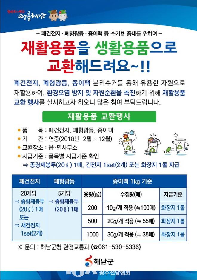 ¿ÃÇØ óÀ½À¸·Î µµÀԵǴ ÀÚ¿øÀçȰ¿ë Ȱ¼ºÈ »ç¾÷Àº ÆóÀÚ¿øÀ» °¡±î¿î À¾¸é»ç¹«¼Ò·Î °¡Á®°¡¸é »ýȰ¿ëǰÀ¸·Î ±³È¯ÇØ ÁÖ°Ô µÈ´Ù. Æó°ÇÀüÁö´Â 20°³´ç Á¾·®Á¦ºÀÅõ(20L) 1¸Å ¶Ç´Â »õ °ÇÀüÁö 2°³, ÆóÇü±¤µîÀº 5°³´ç Á¾·®Á¦ºÀÅõ(20L) 1¸Å, Á¾ÀÌÆÑÀº 1kg´ç ÈÀåÁö 1·Ñ°ú ¹Ù²Ü ¼ö ÀÖ´Ù.