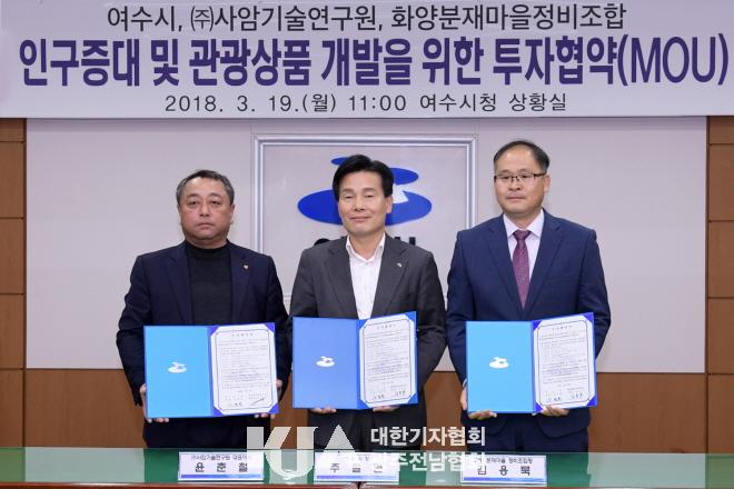 ¿©¼ö½Ã´Â 19ÀÏ ¿ÀÀü ½Ãû »óȲ½Ç¿¡¼ ¢ß»ç¾Ï±â¼ú¿¬±¸¿ø, ȾçºÐÀ縶À»Á¤ºñÁ¶ÇÕ°ú ÀÌ °°Àº ³»¿ëÀÇ ÅõÀÚÇù¾àÀ» ü°áÇß´Ù°í ¹àÇû´Ù. À̳¯ ÁÖöÇö ¿©¼ö½ÃÀå°ú À±Ãáö ¢ß»ç¾Ï±â¼ú¿¬±¸¿ø ´ëÇ¥, ±è¿ë¹¬ ȾçºÐÀ縶À»Á¤ºñÁ¶ÇÕÀå µîÀº °¢°¢ 150¾ï ¿ø, 225¾ï ¿ø µî ÃÑ 375¾ï ¿øÀÇ ÅõÀÚ¸¦ ¾à¼ÓÇß´Ù.