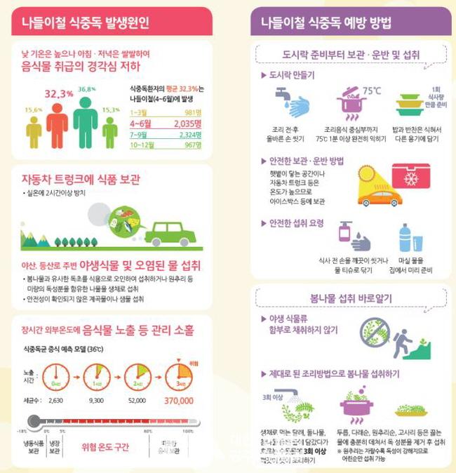 º½Ã¶Àº ²É³îÀÌ, ÇöÀåÇнÀ µî ¾ß¿ÜȰµ¿ÀÌ ¸¹¾Æ ±è¹ä, µµ½Ã¶ô µî¿¡ ÀÇÇÑ ½ÄÁßµ¶ÀÌ ¹ß»ýÇÒ ¿ì·Á°¡ ³ôÀº °èÀýÀÌ´Ù. Áúº´°ü¸®º»ºÎ°¡ 5³â(2011~15³â)°£ ½ÄÁßµ¶ ¹ß»ý ÇöȲÀ» ºÐ¼®ÇÑ ¹Ù¿¡ µû¸£¸é ½ÄÁßµ¶Àº ¿¬°£ Æò±Õ 69°Ç(Àüü286°Ç)ÀÌ ¹ß»ýÇß°í, Æò±Õ 32%°¡ º½Ã¶(4~6¿ù)¿¡ ³ªÅ¸³µ´Ù.