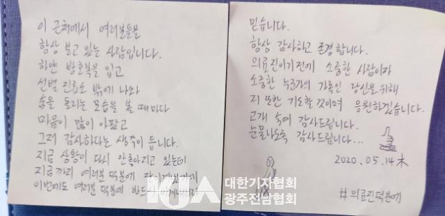 Áö³´Þ µ¿±¸º¸°Ç¼Ò ¼±º°Áø·á¼Ò¸¦ ¹æ¹®ÇÑ ÇÑ Á¶¼±´ë ÀçÇлýÀº ÆíÁö¿Í °£½Ä°Å¸®¸¦ Àü´ÞÇß´Ù. ÀÌ ÇлýÀÌ º¸³½ ÆíÁö¿¡´Â ¡°Áö±Ý È긮´Â ¶¡¹æ¿ïÀÌ ¾ó¸¶³ª °¡Ä¡ ÀÖ´Â °ÍÀÎÁö Ç×»ó ±â¾ï ÇϰڽÀ´Ï´Ù¡±´Â ÀÀ¿øÀÇ ¸Þ½ÃÁö¸¦ ³²°å´Ù.