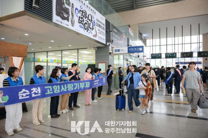 [´ëÇѱâÀÚÇùȸ ¼øÃµ½ÃÁöȸ] ¼øÃµ½Ã(½ÃÀå ³ë°ü±Ô)´Â 2ÀÏ ¼øÃµ¿ª ±¤Àå¿¡¼ Ãß¼®À» ¸Â¾Æ °íÇâÀ» ¹æ¹®ÇÏ´Â ±Í¼º°´°ú °ü±¤°´À» ´ë»óÀ¸·Î ȯ¿µ Çà»ç¿Í ½ÃÁ¤ È«º¸È°µ¿À» ÆîÃÆ´Ù.
