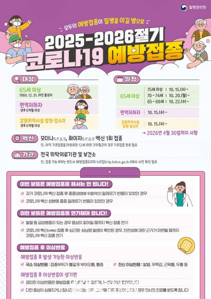 À̹ø Á¢Á¾Àº 15ÀϺÎÅÍ ½ÃÀ۵Ǹç, ¿ä¾çº´¿ø¡¤¿ä¾ç½Ã¼³ µî °¨¿°Ãë¾à½Ã¼³ ÀÔ¿ø(ÀÔ¼Ò)ÀÚ¿Í ¸é¿ªÀúÇÏÀÚ, 75¼¼ ÀÌ»ó ¾î¸£½ÅÀ» Áß½ÉÀ¸·Î ½ÃÇàÇÑ µÚ 20ÀϺÎÅÍ 70~74¼¼, 22ÀϺÎÅÍ 65~69¼¼ ¼øÀ¸·Î È®´ëµÈ´Ù. Á¢Á¾´ë»óÀÚ´Â ÁÖ¼ÒÁö¿Í °ü°è¾øÀÌ Àü±¹ À§Å¹ÀÇ·á±â°ü, º¸°Ç¼Ò¿¡¼ ½ÅºÐÁõÀ» ÁöÂüÇϸé Á¢Á¾ °¡´ÉÇÏ´Ù.