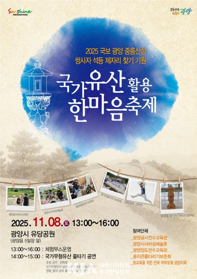 À̹ø Çà»ç¿¡´Â ±¤¾çÀÇ ±¹°¡À¯»êÀ» ³Î¸® ¾Ë¸®±â À§ÇØ Èû½á¿Â ¡ã±¤¾çÀåµµÀü¼ö±³À°°ü ¡ã±¤¾ç±Ã½ÃÀü¼ö±³À°°ü ¡ã¿ëÁöÅ«Áٴٸ®±âº¸Á¸È¸ ¡ã±¤¾ç½Ã»ç¶ó½Ç¿¹¼úÃÌ ¡ãÂü±³À°À» À§ÇÑ Àü±¹Çкθðȸ ±¤¾çÁöȸ 5°³ ´Üü°¡ Âü¿©ÇÑ´Ù.