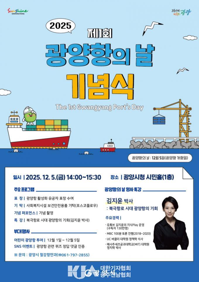 ¡®±¤¾çÇ×ÀÇ ³¯¡¯(12¿ù 5ÀÏ¡¤±¤¾çÇ× °³Ç×ÀÏ)Àº Ç׸¸»ê¾÷¿¡ ´ëÇÑ ½Ã¹ÎµéÀÇ ÀÌÇØ¿Í °ü½ÉÀ» ³ôÀ̱â À§ÇØ ÁöÁ¤µÈ ±â³äÀÏÀÌ´Ù. ±¤¾çÇ×Àº ¼öÃâÀÔ ¹°µ¿·® ±¹³» 1À§, ÃÑ ¹°µ¿·® 2À§ Ç׸¸À¸·Î Áö¿ª°æÁ¦¿¡¼­ ÁßÃßÀû ¿ªÇÒÀ» Çϰí ÀÖÀ¸³ª, ö°­»ê¾÷¿¡ ºñÇØ ½Ã¹Î ü°¨µµ°¡ ³·´Ù´Â ÀǰßÀÌ À̾îÁ® ¿Ô´Ù. ÀÌ¿¡ ±¤¾ç½Ã´Â ±¤¾çÇ×»ó»ýÇù·ÂÇùÀÇȸ ³íÀǸ¦ °ÅÃÄ Áö³­ 2¿ù ¡®±¤¾çÇ×ÀÇ ³¯¡¯À» °ø½Ä ÁöÁ¤Çß´Ù.