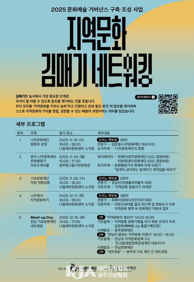 ³ªÁÖ¹®ÈÀç´Ü(ÀÌ»çÀå À±º´ÅÂ)Àº ¿À´Â 12¿ù 16ÀÏ ³ªºô·¹¶ó¹®È¼¾ÅÍ ¼Ò±ØÀå¿¡¼ ¡®Meet-up Day(¹Ô¾÷µ¥ÀÌ)¡¯¸¦ ¿°í Àü³²¡¤±¤ÁÖ±Ç ±¤¿ª¡¤±âÃʹ®ÈÀç´Ü°ú ÇÔ²² Áö¿ª¹®È Çù·Âü°è¸¦ ±¸ÃàÇÑ´Ù°í 11ÀÏ ¹àÇû´Ù.