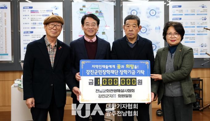 À±ÁØÈ£ Àü³²¹®È°ü±¤Çؼ³»çÇùȸ °Áø±ºÁöȸ ȸÀåÀº 1¹é¸¸ ¿øÀ» ±âŹ ÇßÀ¸¸ç, 2008³âºÎÅÍ ÃÑ 13ȸ, ´©Àû 1õ3¹é¸¸ ¿øÀ» ÀåÇбÝÀ¸·Î Àü´ÞÇØ ¿À¸ç °ÁøÀÇ ¹®È¡¤°ü±¤ ¹ßÀü°ú ÇÔ²² ¹Ì·¡¼¼´ë À°¼º¿¡µµ ÈûÀ» º¸Å°í ÀÖ´Ù. À±ÁØÈ£ ȸÀåÀº ¡°À̹ø ÀåÇбÝÀÌ ¾î·Á¿î ÇлýµéÀÌ Çо÷¿¡ Àü³äÇÒ ¼ö ÀÖ´Â µçµçÇÑ µðµõµ¹ÀÌ µÇ±æ ¹Ù¶õ´Ù¡±°í ÀüÇß´Ù.