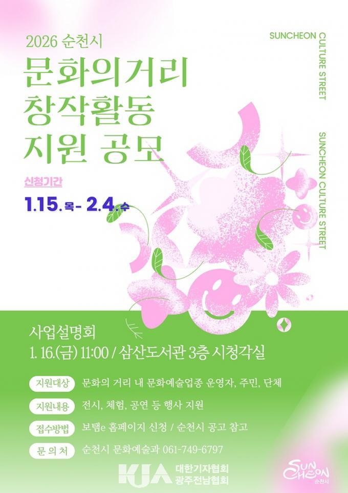 [´ëÇѱâÀÚÇùȸ ¼øÃµ½ÃÁöȸ] ¼øÃµ½Ã´Â ¹®ÈÀÇ °Å¸®¸¦ ¿¹¼úÆ¯È °ÅÁ¡Áö¿ªÀ¸·Î À°¼ºÇϰí Áö¿ª ¿¹¼úÀÎÀÇ Áö¼Ó°¡´ÉÇÑ Ã¢ÀÛȰµ¿À» Áö¿øÇϱâ À§ÇØ ¡®2026³â ¼øÃµ½Ã ¹®ÈÀÇ °Å¸® âÀÛȰµ¿ Áö¿ø»ç¾÷¡¯ Âü¿©ÀÚ¸¦ °ø°³ ¸ðÁýÇÑ´Ù°í ¹àÇû´Ù.