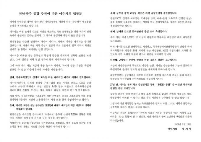 Á¤±â¸í ¿©¼ö½ÃÀåÀº ¡°¿©¼ö´Â °ú°Å Àü±¹ ÃÖÃÊ·Î ÁֹιßÀǸ¦ ÅëÇÑ ¡®3·Á ÅëÇÕ¡¯À» ÀÌ·ï³½ ÀÚÄ¡ ºÐ±ÇÀÇ »ó¡Àû µµ½Ã¡±¶ó¸ç ¡°À̹ø ÇàÁ¤ÅëÇÕÀÌ ¿©¼öÀÇ Á¤Ã¼¼ºÀ» ÁöŰ¸é¼­µµ »õ·Î¿î µµ¾àÀÇ ±âȸ°¡ µÉ ¼ö ÀÖµµ·Ï ½Ã¹Îµé°ú ÇÔ²² Ä¡¹ÐÇÏ°Ô ´ëÀÀÇØ ³ª°¡°Ú´Ù¡±¶ó°í ¹àÇû´Ù.