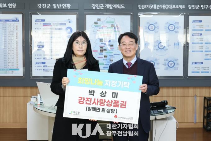 ¹Ú»ó¹Ì ¾¾´Â Áö³­ÇØ ¿¬¸» °­Áø·ÎŸ¸® Çà»ç¿¡¼­ ¹ÞÀº °æÇ°ÀÎ °­Áø»ç¶û»óǰ±Ç 100¸¸ ¿ø Àü¾×À» ±âŹÇϸç Áö¿ªÀ» À§ÇÑ Ã¹ ¸¶À½À» ½ÇõÇß´Ù. µþ±â¼öÃ⿬±¸È¸´Â Çö±Ý 100¸¸ ¿ø°ú ÇÔ²² µþ±â 1.32kg 50»óÀÚ¸¦, ¾ÆÆ®ÆÊ¿µ³óÁ¶ÇÕ¹ýÀÎÀº ÆÄÇÁ¸®Ä« 2.5kg 800»óÀÚ¸¦ ±âºÎÇϸç Áö¿ª ³ó»ê¹° ³ª´®À» ½ÇõÇß´Ù. ±èâ³² ±ÝµÎ²¨ºñ ´ëÇ¥´Â 700ÀκРºÐ·®ÀÇ »ç°ñ±¹À» Àü´ÞÇØ Àú¼Òµæ ÁֹΠ°Ü¿ïö ½Ä»ýȰ Áö¿ø¿¡ ÈûÀ» º¸ÅÉ´Ù.