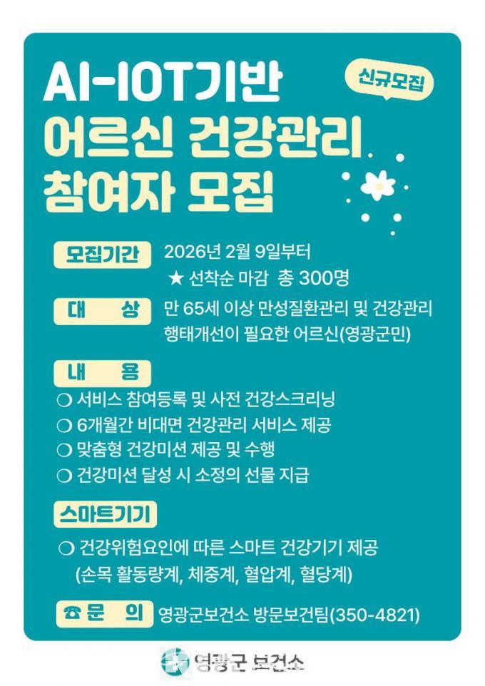 [´ëÇѱâÀÚÇùȸ ¿µ±¤±ºÁöȸ] ¿µ±¤±ºÀº Ãʰí·ÉÈ­ ½Ã´ë¿¡ ´ëºñÇØ 65¼¼ ÀÌ»ó ¿µ±¤±º¹ÎÀ» ´ë»óÀ¸·Î AI・IoT(ÀΰøÁö´É»ç¹°ÀÎÅͳÝ)±â¹Ý ¾î¸£½Å °Ç°­°ü¸®»ç¾÷ ½Å±Ô Âü¿©ÀÚ 300¸íÀ» 2¿ù 9ÀϺÎÅÍ ¼±Âø¼ø ¸ðÁýÇÑ´Ù°í ¹àÇû´Ù.