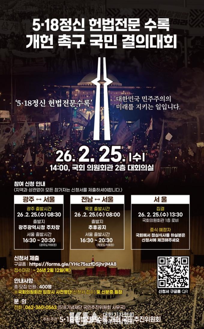±¤ÁÖ±¤¿ª½Ã(½ÃÀå °±âÁ¤)´Â Àü±¹ ½Ã¹Î»çȸ´Üü, Á¾±³°è, ¿À¿ù´Üü, ±¤ÁÖ½Ã, Àü³²µµ µîÀ¸·Î ±¸¼ºµÈ ¡®5¡¤18 Çå¹ýÀü¹® ¼ö·Ï °³Çå ±¹¹ÎÃßÁøÀ§¿øÈ¸¡¯(ÀÌÇÏ ÃßÁøÀ§¿øÈ¸)°¡ ¿À´Â 25ÀÏ ¿ÀÈÄ 2½Ã ±¹È¸ ÀÇ¿øÈ¸°ü 2Ãþ ´ëȸÀǽǿ¡¼ ¡®5¡¤18Á¤½Å Çå¹ýÀü¹® ¼ö·Ï °³Çå Ã˱¸ ±¹¹Î°áÀÇ´ëȸ¡¯¸¦ °³ÃÖÇÑ´Ù°í 4ÀÏ ¹àÇû´Ù.