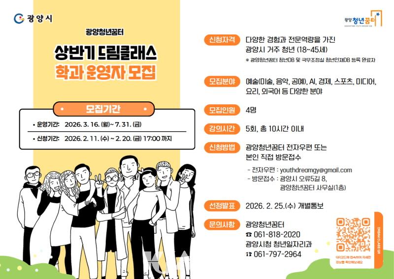| ±¤¾çû³â²ÞÅÍ, 2026 »ó¹Ý±â µå¸²Å¬·¡½º ¿î¿µÀÚ ¸ðÁý û³â ¼ö¿äÁ¶»ç °á°ú ¹Ý¿µÇØ »ó¹Ý±â 4°³ °Á ¾ö¼± ¿î¿µ |