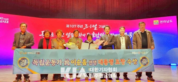 Áö³ 3¿ù 1ÀÏ Àü³²µµÃ» ±è´ëÁß°´ç¿¡¼ ¿¸° Á¦107ÁÖ³â 3¡¤1Àý ±â³ä½Ä¿¡¼´Â ÀåÈï Ãâ½Å °í(ͺ) À̼øÈì ¼±»ý(1908.2.13.~1985.6.1.)ÀÌ µ¶¸³À¯°øÀÚ ´ëÅë·É ǥâÀ» ¼ö»óÇß´Ù.