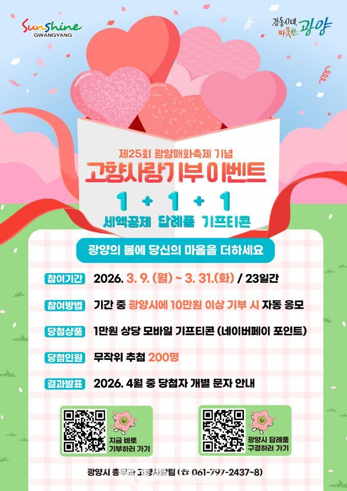 | ±¤¾ç½Ã, Á¦25ȸ ±¤¾ç¸ÅÈÃàÁ¦ ±â³ä °íÇâ»ç¶û±âºÎ À̺¥Æ® ½Ç½Ã 10¸¸ ¿ø ±âºÎÇÏ¸é ¼¼¾×°øÁ¦¡¤´ä·Êǰ¡¤±âÇÁƼÄÜ ¡®1+1+1¡¯ ÇýÅà |
