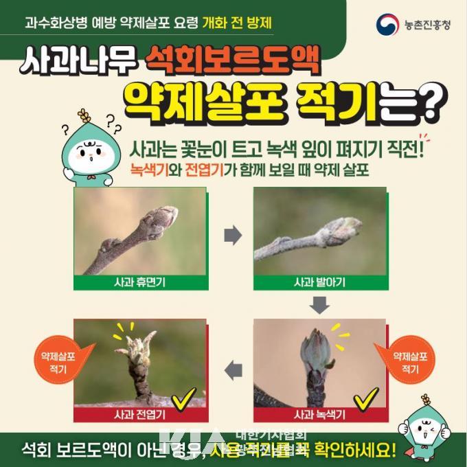 °³È Àü ¹æÁ¦´Â ¹èÀÇ °æ¿ì ²É´«ÀÌ Æ° Á÷ÈÄ, »ç°úÀÇ °æ¿ì ²É´«ÀÌ Æ®°í ³ì»ö ÀÙÀÌ ÆìÁö±â Á÷Àü¿¡ ½Ç½ÃÇØ¾ß ÇÑ´Ù. ¶ÇÇÑ °ú¼öÀÇ »ýÀ° ´Ü°è¸¦ È®ÀÎÇÑ µÚ Àû±â¿¡ 1Â÷ ¾àÁ¦¸¦ »ìÆ÷ÇØ¾ß Çϸç, ¼®È¸À¯È²ÇÕÁ¦¿Í ÇÔ²² »ìÆ÷ÇÒ °æ¿ì ¾àÇØ°¡ ¹ß»ýÇÒ ¼ö ÀÖ¾î ¼®È¸À¯È²ÇÕÁ¦ »ìÆ÷ ÈÄ ÃÖ¼Ò 7ÀÏ ÀÌ»óÀÇ °£°ÝÀ» µÎ¾î¾ß ÇÑ´Ù.