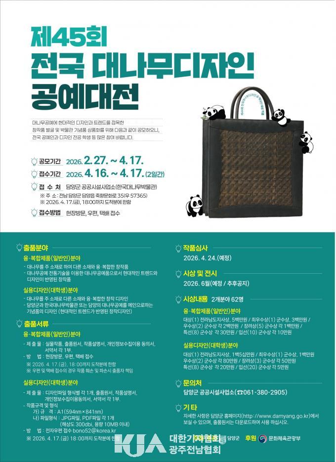 | ´ã¾ç±º, Á¦45ȸ ´ë³ª¹« µðÀÚÀÎ °ø¿¹´ëÀü °³ÃÖ 4¿ù 16~17ÀÏ Á¢¼ö, 5¿ù ´ë³ª¹« ÃàÁ¦ ±â°£ ÀÔ»óÀÛ Æ¯º° Àü½Ã |
