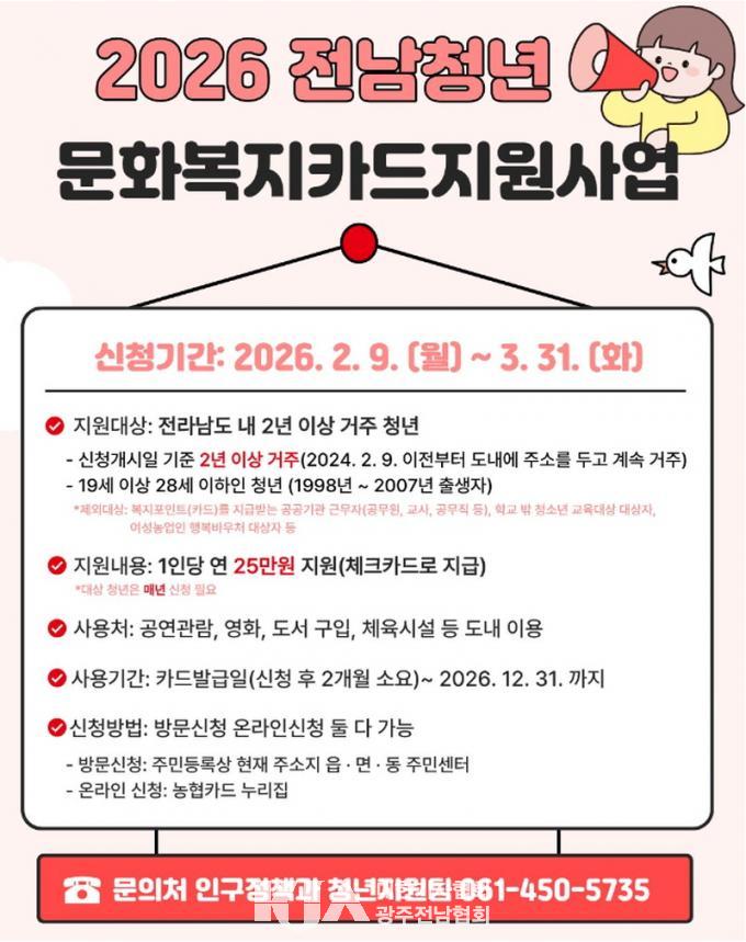 [´ëÇѱâÀÚÇùȸ ¹«¾È±ºÁöȸ ¹ÚÁ¶Çå ±âÀÚ] ¹«¾È±º(±º¼ö ±è»ê)Àº û³âÀÇ ¹®È»ýȰ°ú ÀÚ±â°è¹ßÀ» Áö¿øÇϱâ À§ÇØ ¡®2026³â Àü³² û³â ¹®Èº¹ÁöÄ«µå Áö¿ø»ç¾÷¡¯ ´ë»óÀÚ¸¦ ¸ðÁýÇϰí ÀÖ´Ù°í ¹àÇû´Ù.