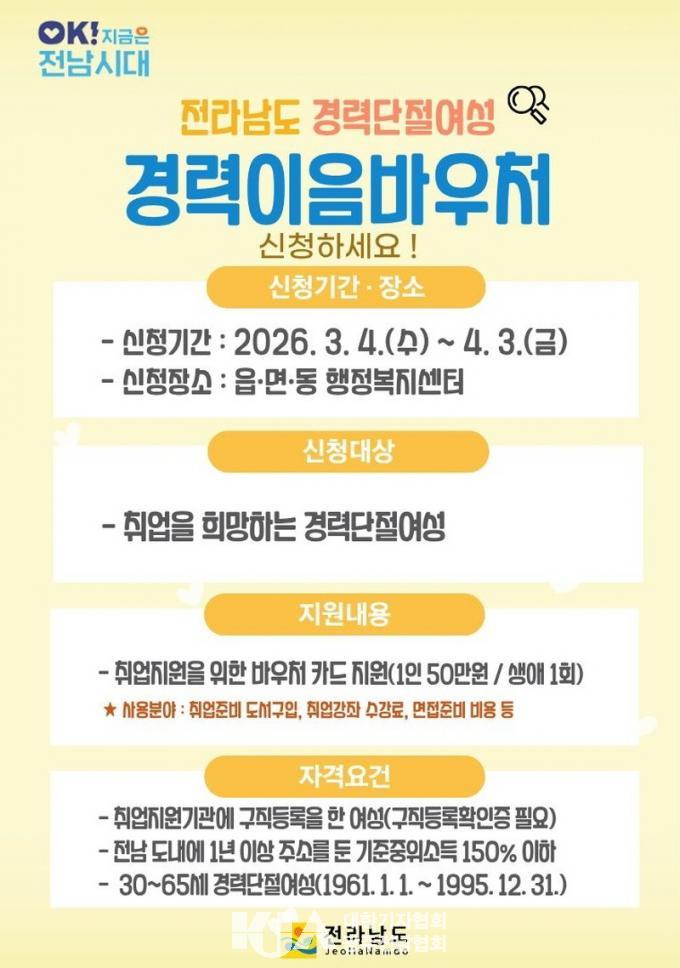 °æ·ÂÀÌÀ½ ¹Ù¿ìó´Â ½ÅûÀÏ ÇöÀç Àü³²¿¡ 1³â ÀÌ»ó ÁÖ¼Ò¸¦ µÎ°í, Ãë¾÷ Áö¿ø±â°ü¿¡ ±¸Á÷À» µî·ÏÇÑ 30~65¼¼(1961³â~1995³â Ãâ»ý)·Î ÀçÃë¾÷À» Èñ¸ÁÇÏ´Â ÁßÀ§¼Òµæ 150% ÀÌÇÏ °æ·Â´ÜÀý ¿©¼ºÀ» ´ë»óÀ¸·Î Áö¿øÇÑ´Ù.