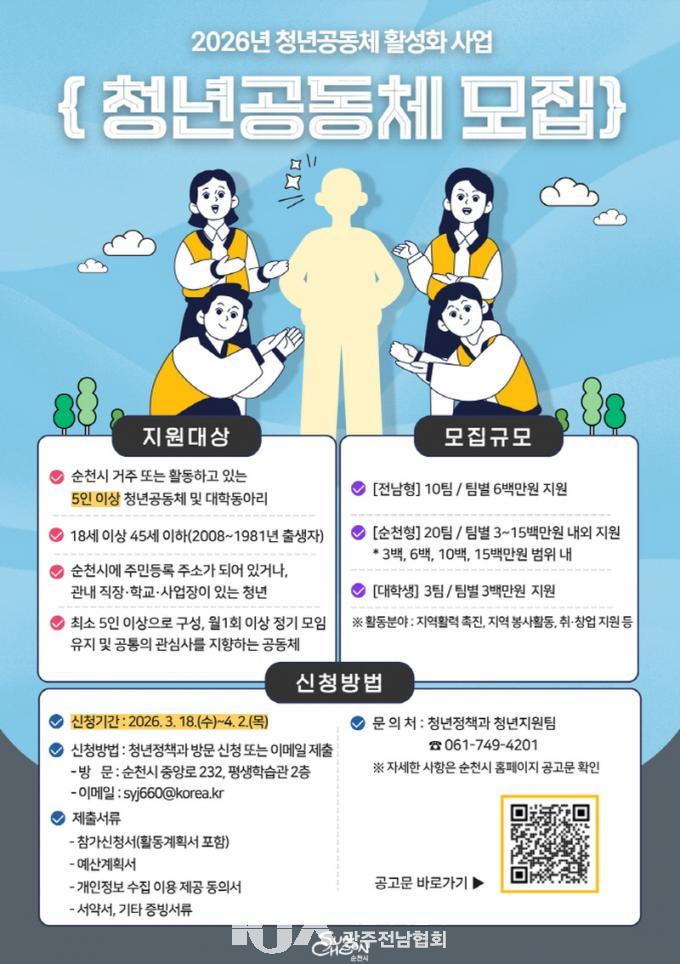 | ¼øÃµ½Ã, 2026³â û³â°øµ¿Ã¼ Ȱ¼ºÈ »ç¾÷ Âü¿©ÆÀ ¸ðÁý ´ëÇлý µ¿¾Æ¸®±îÁö ´ë»ó È®´ë, ÃÑ 33°³ ÆÀ¿¡ ºÐ¾ßº° ¸ÂÃãÇü Áö¿ø |