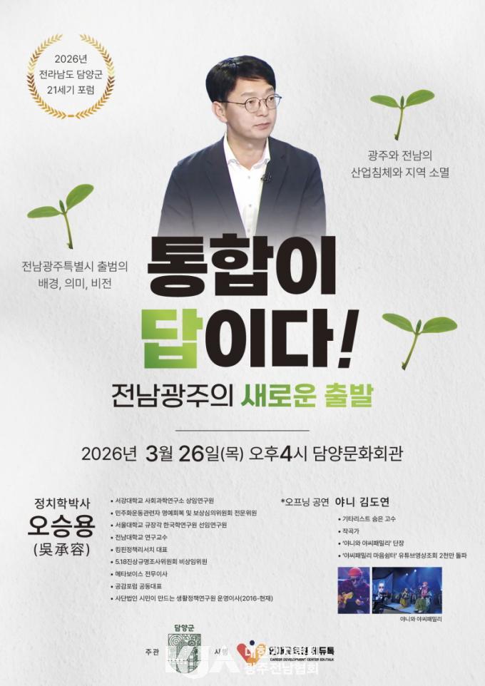 À̹ø Æ÷·³Àº Àü³²¡¤±¤ÁÖ ÅëÇÕÀÇ Çʿ伺°ú ¹Ì·¡ ºñÀüÀ» ¸ð»öÇϱâ À§ÇØ Á¤Ä¡ÇÐ ¹Ú»ç ¿À½Â¿ë °­»ç¸¦ ÃÊû, ¡®ÅëÇÕÀÌ ´äÀÌ´Ù. Àü³²¡¤±¤ÁÖÀÇ »õ·Î¿î Ãâ¹ß¡¯À» ÁÖÁ¦·Î ±º¹Î°ú ¸¸³­´Ù.