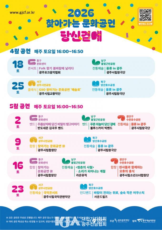 ¿ÃÇØ ù ¸·À» ¿Ã¸®´Â 4¿ù18ÀÏ °ø¿¬Àº µ¿±¸¿Í ³²±¸¿¡¼ °¢°¢ ÁøÇàµÈ´Ù. µ¿±¸¹®È¼¾ÅÍ¿¡¼´Â ±¤ÁÖÆ÷Å©À½¾ÇÇùȸÀÇ ¡®ÄܼƮ–Æ÷Å©(Folk), Çâ±â º½¹Ù¶÷¿¡ ³¯¸®´Ù¡¯ ¹êµå °ø¿¬ÀÌ, ³²±¸ ¹°ºû±Ù¸°°ø¿ø¿¡¼´Â ±¤Áֽø³Ã¢±Ø´ÜÀÇ ¡®Ç³·ù ÀÎ(in) ±¤ÁÖ¡¯ ÀüÅ뿹¼ú °ø¿¬ÀÌ ¹«´ë¿¡ ¿À¸¥´Ù.