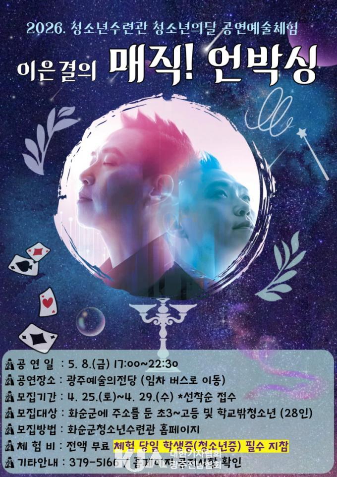 | ȼø±º û¼Ò³â¼ö·Ã°ü, û¼Ò³âÀÇ ´Þ °ø¿¬¿¹¼úüÇè ¡®ÀÌÀº°áÀÇ ¸ÅÁ÷! ¾ð¹Ú½Ì¡¯ Âü°¡ÀÚ ¸ðÁý ȯ»óÀûÀÎ ¸¶¼ú°ø¿¬ ¼±»ç... 4¿ù 25ÀÏ~4¿ù 29ÀÏ ½Åû¡¤Á¢¼ö |