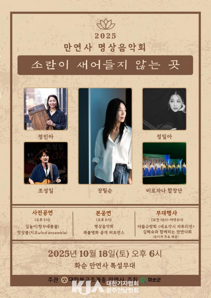 È­¼ø±ºÀÌ ÁÖÃÖÇÏ°í ¸¸¿¬»ç°¡ ÁÖ°üÇÏ´Â À̹ø »ê»çÀ½¾Çȸ´Â 1208³â ¼³¸³µÈ õ³â°íÂû ¸¸¿¬»çÀÇ ¿îÄ¡ Àִ dz°æÀ» ¹è°æ »ï¾Æ ¡®¼Ò¶õÀÌ »õ¾îµéÁö ¾Ê´Â °÷¡¯À̶õ ÁÖÁ¦ÀÇ ¸í»óÀ½¾Çȸ¸¦ ÅëÇØ ¸¶À½ÀÚ¸®¸¦ µé¿©´Ùº¸´Â ½Ã°£À¸·Î ±âȹµÇ¾ú´Ù.