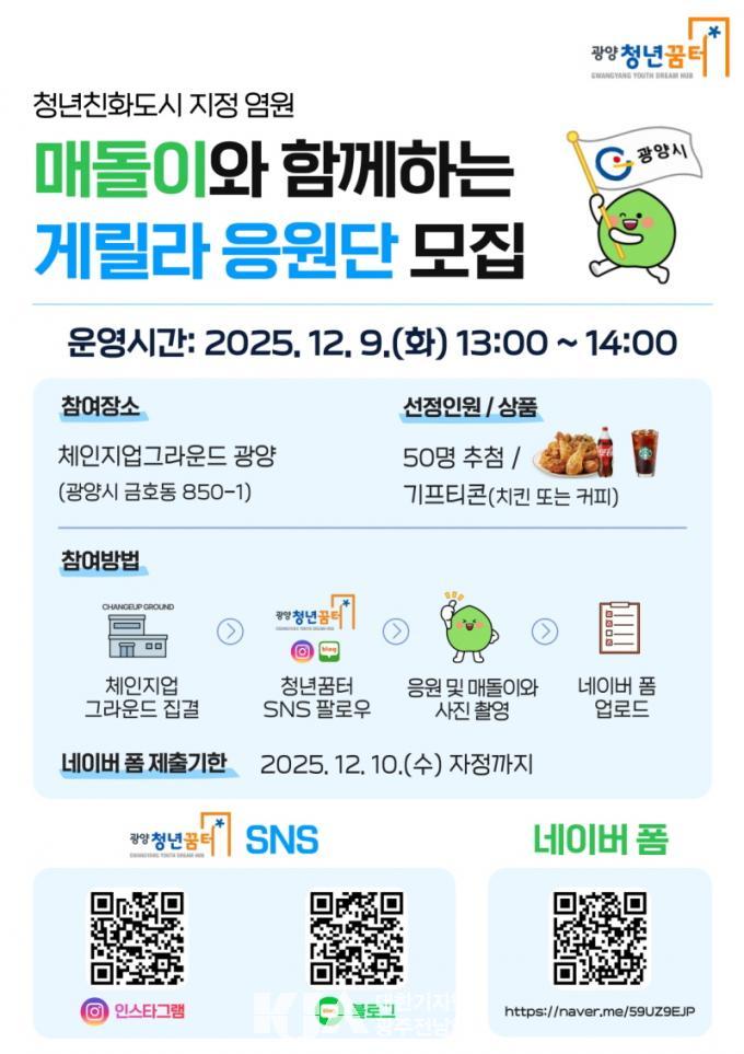 [´ëÇѱâÀÚÇùȸ ±¤¾ç½ÃÁöȸ] ±¤¾ç½Ã´Â û³âģȵµ½Ã ÁöÁ¤¿¡ ´ëÇÑ ½Ã¹Î °ø°¨´ë¸¦ È®»êÇϰí û³â Âü¿© ºÐÀ§±â¸¦ Á¶¼ºÇϱâ À§ÇØ ¿À´Â 12¿ù 9ÀÏ(È) ¿ÀÈÄ 1½ÃºÎÅÍ 2½Ã±îÁö üÀÎÁö¾÷±×¶ó¿îµå ±¤¾ç ÀÏ´ë¿¡¼ ¡®¸Åµ¹ÀÌ¿Í ÇÔ²²Çϴ û³âģȵµ½Ã ÁöÁ¤ ¿°¿ø °Ô¸±¶ó ÀÀ¿ø´Ü¡¯À» ¿î¿µÇÑ´Ù°í 5ÀÏ ¹àÇû´Ù.