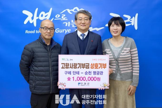 À̹ø »óÈ£ ±âºÎ´Â ±¸·Ê±º »êµ¿¸é ¼ÒÀç ¿Ü½Ä¾÷üÀÎ ´ÜÅ×ÀÇ ³ëÇöÁ¤ ´ëÇ¥¿Í ¼øÃµ½Ã ¸í±Ã°üÀÇ ¹Ú¼ö¿µ ´ëÇ¥°¡ Áö¿ª¹ßÀüÀ» À§ÇÑ ÀÀ¿øÀ» °ø°¨Çϸç ÀÌ·ç¾î Á³À¸¸ç, °¢ 100¸¸¿ø¾¿À» »óÈ£ ±âŹÇÏ¿´´Ù.
