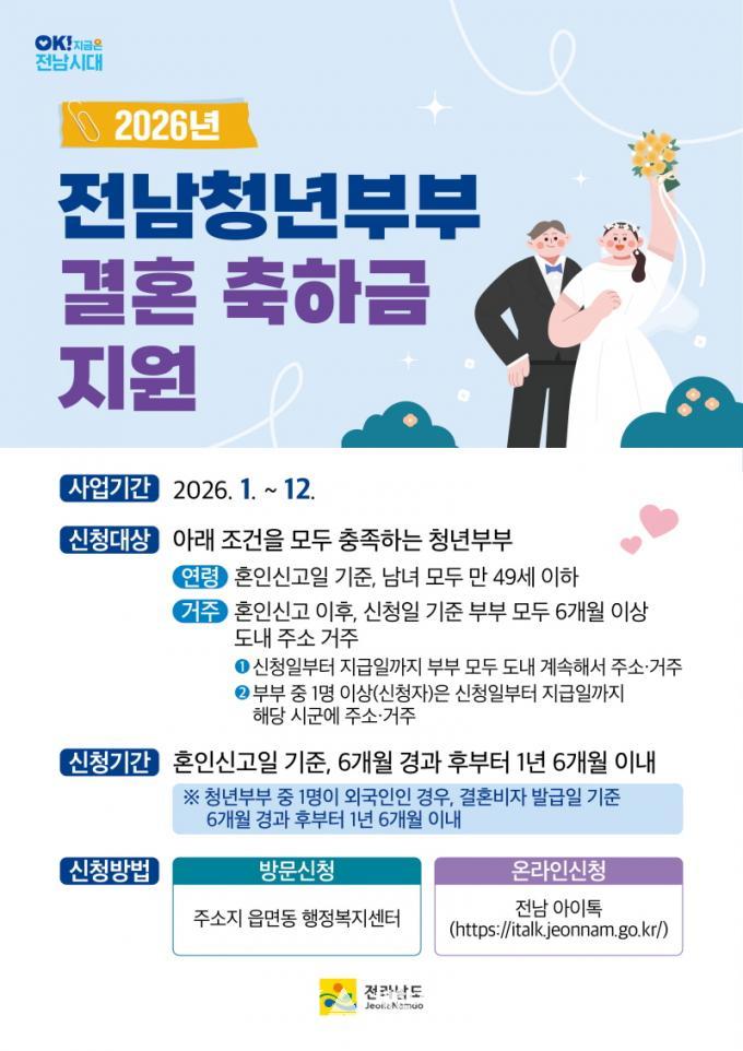 û³âºÎºÎ °áÈ¥ÃàÇÏ±Ý Áö¿ø»ç¾÷Àº Àü³²µµ°¡ 2021³â Àü±¹ ±¤¿ª½Ã¡¤µµ ÃÖÃÊ·Î ½ÃÇàÇß´Ù. Áö¿ø ´ë»óÀº È¥ÀνŰíÀÏ ÇöÀç 49¼¼ ÀÌÇÏ ºÎºÎ´Ù. ½ÅûÀÏ Á÷Àü±îÁö Àü³²¿¡ 6°³¿ù ÀÌ»ó ÁÖ¼Ò¸¦ µÖ¾ß ÇÑ´Ù. È¥ÀνŰí ÈÄ 6°³¿ùÀÌ Áö³ ³¯ºÎÅÍ 1³â 6°³¿ù À̳» ½Åû °¡´ÉÇϸç, ½ÅûÇÑ ´ÞÀÇ ´ÙÀ½ ´Þ 15ÀÏ¿¡ ¹ÞÀ» ¼ö ÀÖ´Ù.