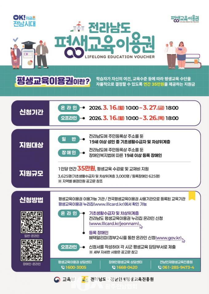 | Àü¶ó³²µµ, 2026 Àú¼ÒµæÃþ.Àå¾ÖÀÎ Æò»ý±³À°ÀÌ¿ë±Ç ½Åû Á¢¼ö 27ÀϱîÁö Á¢¼ö¡¦±³À°±âȸ È®´ëÀ§ÇØ ¿¬ 35¸¸¿ø Áö¿ø |