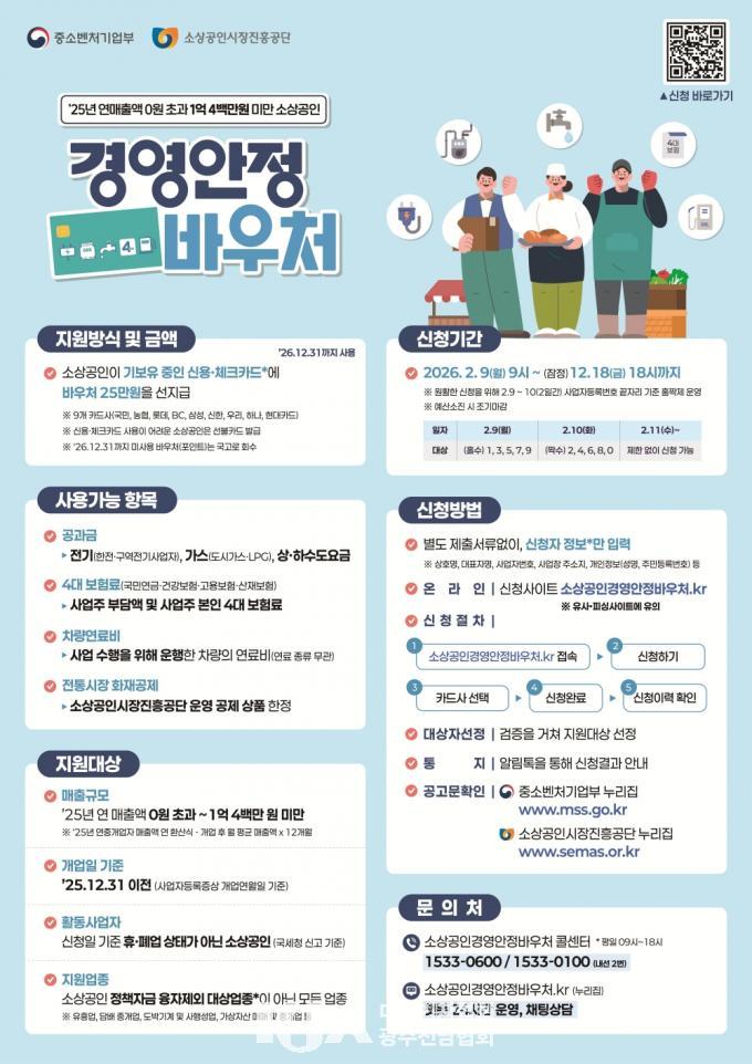 Áö¿ø ´ë»óÀº 2025³â ±âÁØ ¿¬ ¸ÅÃâ¾× 1¾ï 4¹é¸¸¿ø ¹Ì¸¸ÀÇ ¼Ò»ó°øÀÎÀ¸·Î, ½ÅûÀÏ ±âÁØ Á¤»ó ¿µ¾÷ ÁßÀÎ »ç¾÷ÀÚ¶ó¸é ´ëºÎºÐ ½ÅûÀÌ °¡´ÉÇÏ´Ù. ¾÷Á¾ Á¦ÇÑÀÌ ÀϺΠÀÖÀ¸³ª ÀϹÝÀûÀÎ ÀÚ¿µ¾÷ÀÚ´Â Æø³Ð°Ô Áö¿ø ´ë»ó¿¡ Æ÷ÇԵǾî Á¤Ã¥ ü°¨µµ¸¦ ³ô¿´´Ù.