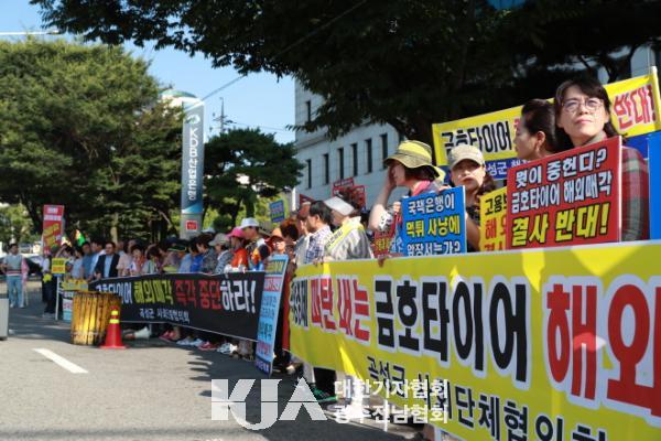 À¯±Ù±â ±º¼ö´Â ¡°ÇØ¿Ü ºÎ½Ç¸Å°¢ ½Ã ±ÝȣŸÀ̾î¿Í Çù·Â¾÷ü ÀÓ?Á÷¿øÀÇ »ýÁ¸±Ç À§Çù°ú ±¤ÁÖ?Àü³² Áö¿ª°æÁ¦¿¡ Å« Ÿ°ÝÀÌ ¿¹»óµÈ´Ù¡±°í ¸»Çϰí, ¡°»ê¾÷ÀºÇàÀÌ Àü¸é¿¡¼ ÇØ¿Ü ºÎ½Ç¸Å°¢À» Áß´ÜÇØ ´Þ¶ó¡±°í È£¼ÒÇß´Ù. ¾Õ¼ À¯ ±º¼ö´Â Áö³ 7¿ù, 5ȸ¿¡ °ÉÃÄ ±ÝȣŸÀÌ ÇØ¿Ü ºÎ½Ç¸Å°¢ ¹Ý´ë 1ÀÎ ½ÃÀ§¸¦ ½Ç½ÃÇÑ ¹Ù ÀÖÀ¸¸ç, 7¿ù 21ÀÏ¿¡´Â ±ÝȣŸÀÌ¾î °î¼º°øÀåÀ» ¹æ¹®ÇØ ÀÓ¿øÁø°ú ³ëµ¿ÀÚ¸¦ À§·ÎÇÑ ¹Ù ÀÖ´Ù.