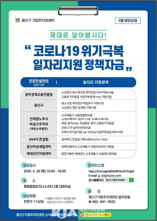ÇÑÆí, »ó´ã¿¡´Â ±¤»ê±¸±â¾÷ÁÖÄ¡ÀǼ¾ÅÍ, ±¤ÁÖ°æÁ¦°í¿ëÁøÈï¿ø, ±¹¹Î³ë¹«¹ýÀÎ ÁøÀ翵 ³ë¹«»ç, ¢ßHPC ÄÁ¼³ÆÃ, ±¤»ê¿©¼º»õÀϼ¾ÅÍ, Á¦´ë±ºÀÎÁö¿ø¼¾ÅÍ µîÀÌ Âü°¡Çϸç, »ó´ãÀ» ¿øÇÏ´Â ±â¾÷Àº ¿Â¶óÀÎÀ¸·Î »ó´ã½Ã°£À» »çÀü ¿¹¾àÇÏ¸é µÈ´Ù.